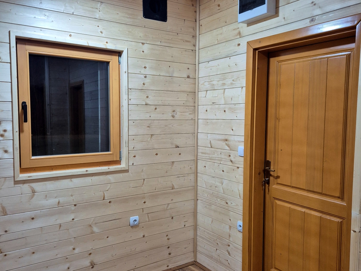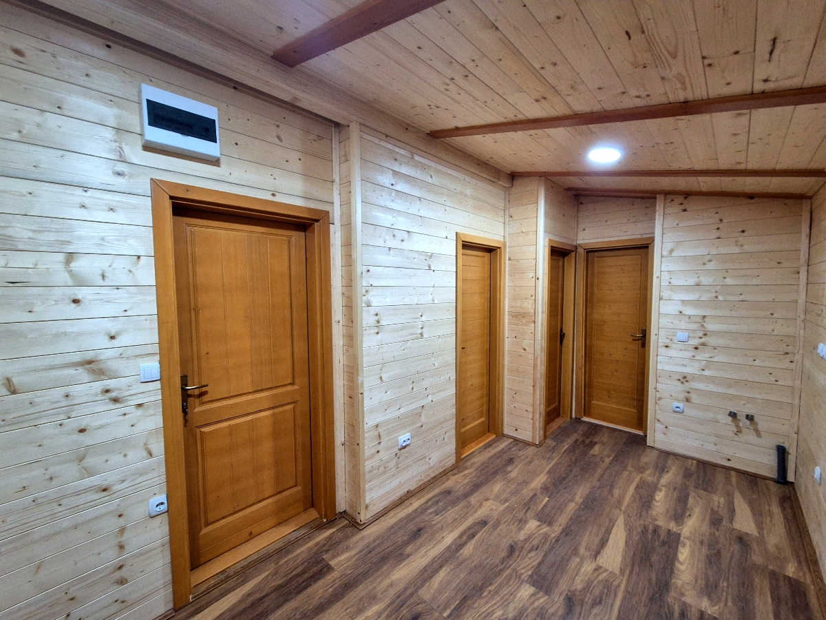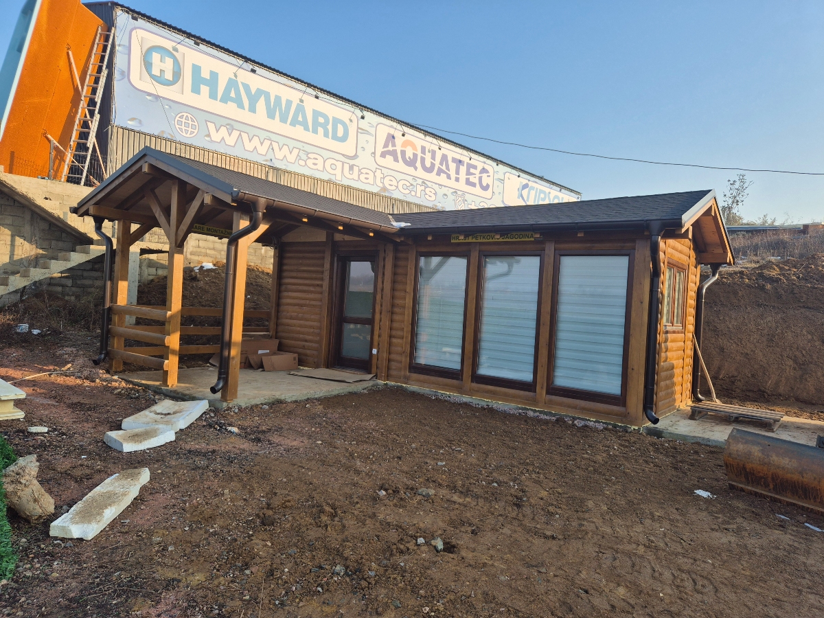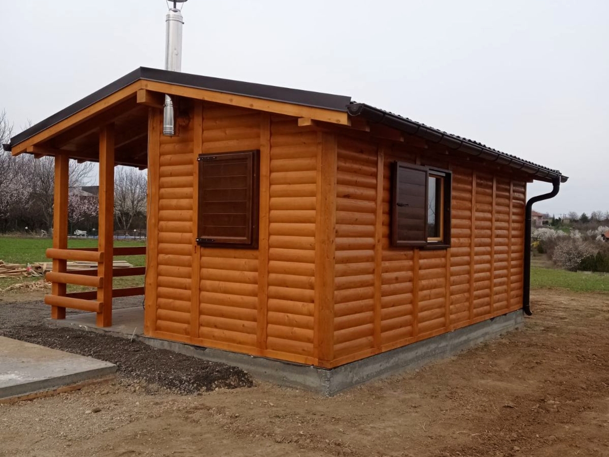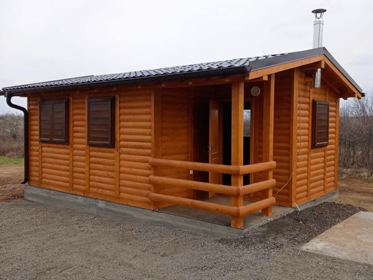 Kompletno završene brvnare od industrijski obrađene i sušene čamove građe, sa vrhunskom termoizolacijom i dugotrajnom obradom. Spoljašnji zidovi od poluoblice 70 mm (ili ravna/kosa daska), masivni stubovi 14 × 14 cm, krov sa OSB pločama i tegolom ili limom po izboru kupca. Kvalitetna drvena stolarija sa dvoslojnim argonskim staklom, kompletne elektro i vodovodne instalacije, potpuno opremljeno kupatilo i završeni podovi sa izolacijom. Završna obrada Sadolinom u tri ruke, u tonu po izboru. Objekat se probno sklapa u proizvodnji i montira kod vas za 2 do 3 dana, uz uključeno 3D idejno rešenje.