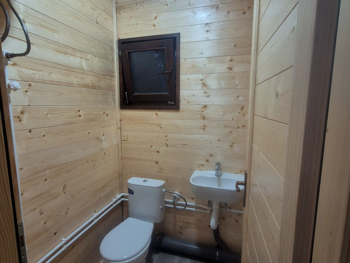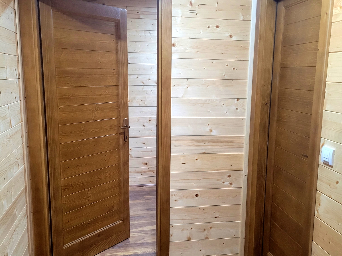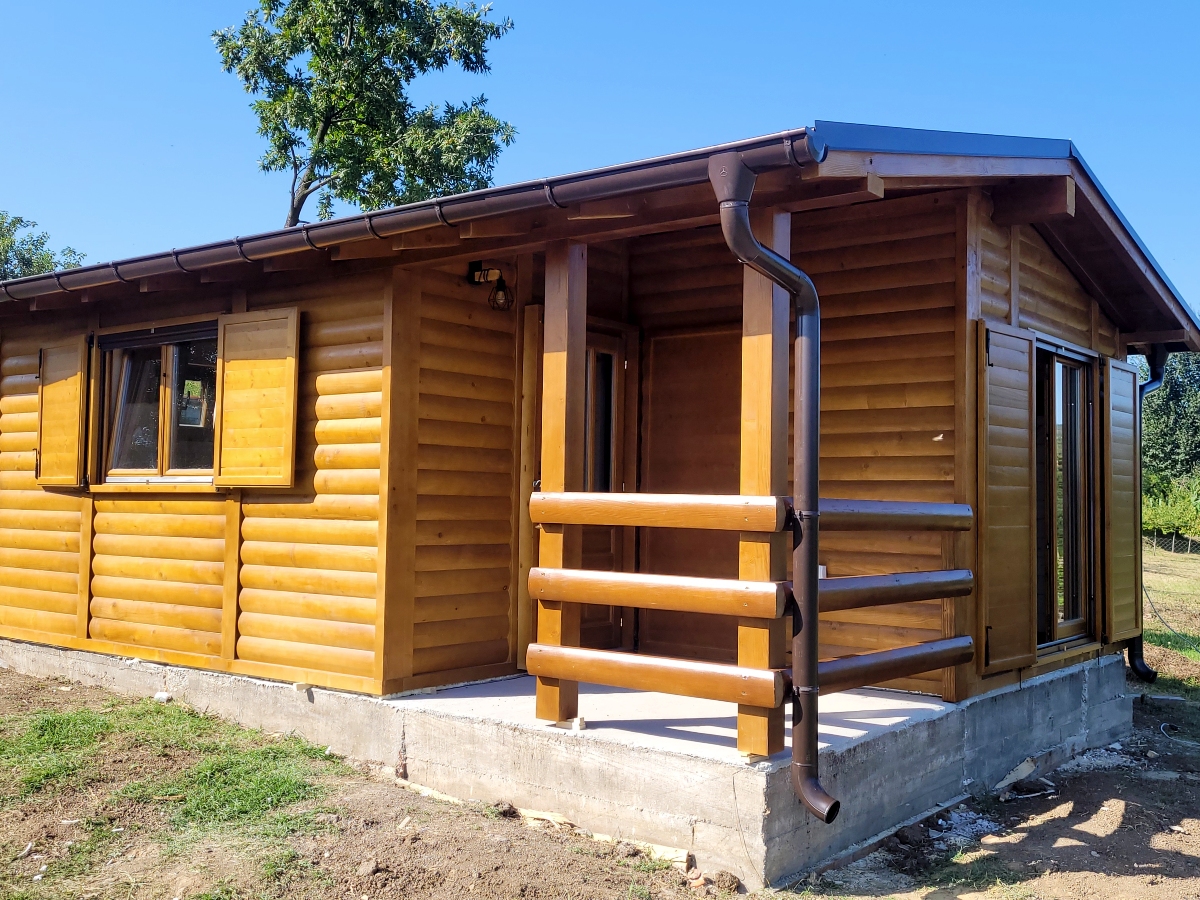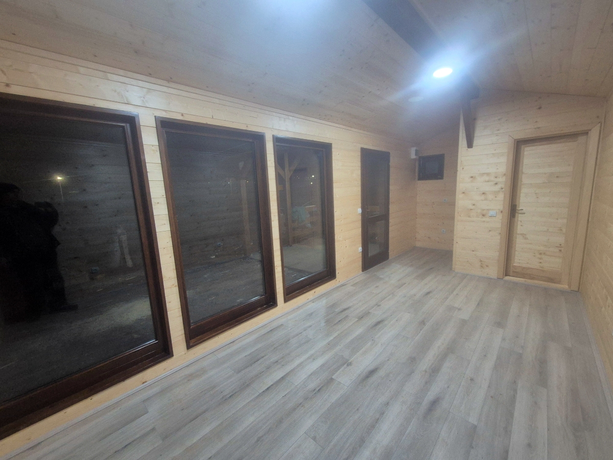 Kompletno završene brvnare od industrijski obrađene i sušene čamove građe, sa vrhunskom termoizolacijom i dugotrajnom obradom. Spoljašnji zidovi od poluoblice 70 mm (ili ravna/kosa daska), masivni stubovi 14 × 14 cm, krov sa OSB pločama i tegolom ili limom po izboru kupca. Kvalitetna drvena stolarija sa dvoslojnim argonskim staklom, kompletne elektro i vodovodne instalacije, potpuno opremljeno kupatilo i završeni podovi sa izolacijom. Završna obrada Sadolinom u tri ruke, u tonu po izboru. Objekat se probno sklapa u proizvodnji i montira kod vas za 2 do 3 dana, uz uključeno 3D idejno rešenje.