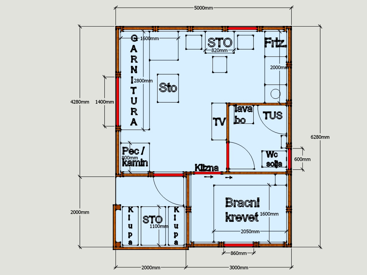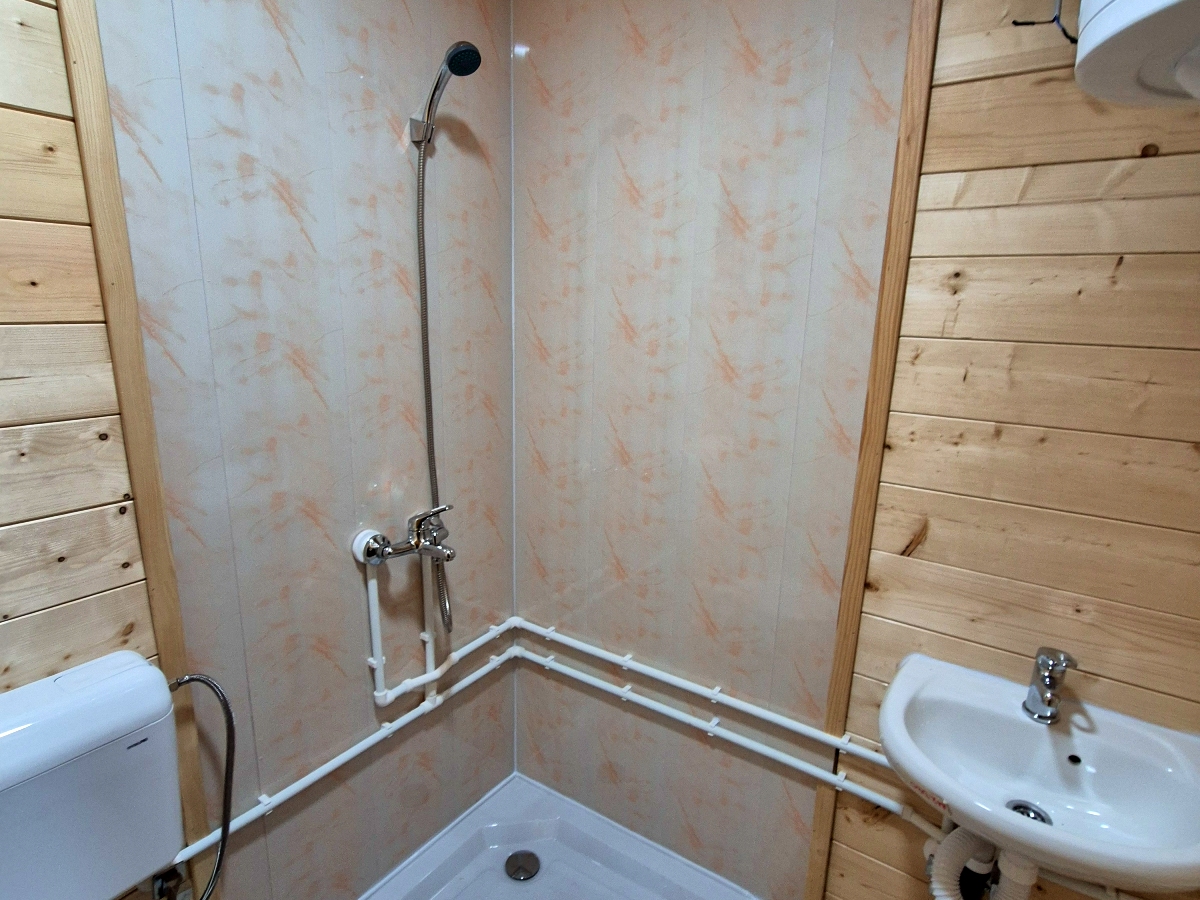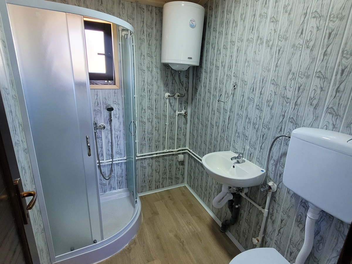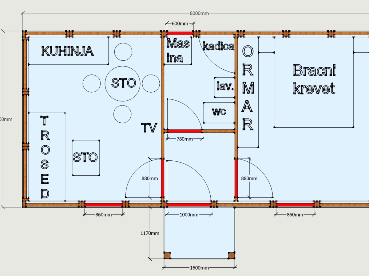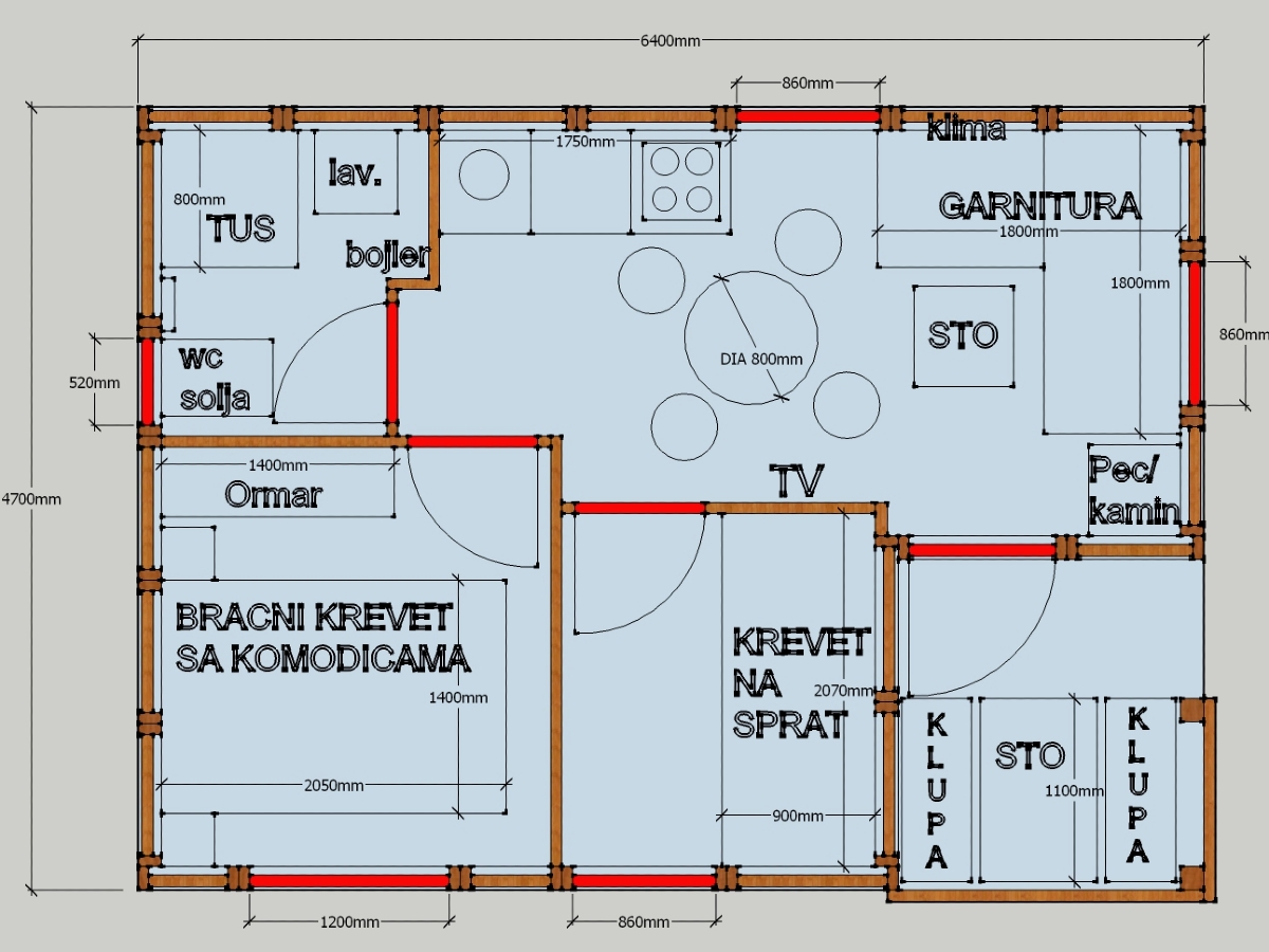 Kompletno završene brvnare od industrijski obrađene i sušene čamove građe, sa vrhunskom termoizolacijom i dugotrajnom obradom. Spoljašnji zidovi od poluoblice 70 mm (ili ravna/kosa daska), masivni stubovi 14 × 14 cm, krov sa OSB pločama i tegolom ili limom po izboru kupca. Kvalitetna drvena stolarija sa dvoslojnim argonskim staklom, kompletne elektro i vodovodne instalacije, potpuno opremljeno kupatilo i završeni podovi sa izolacijom. Završna obrada Sadolinom u tri ruke, u tonu po izboru. Objekat se probno sklapa u proizvodnji i montira kod vas za 2 do 3 dana, uz uključeno 3D idejno rešenje.